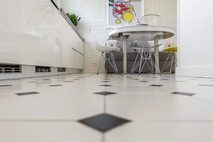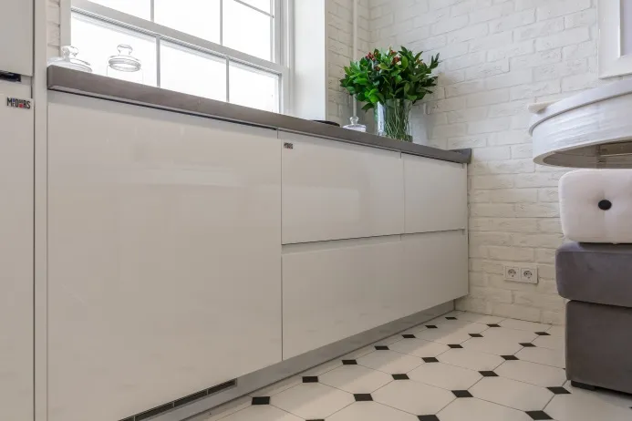 Цоколь под длинной частью кухни тоже выполнен в белом глянце, и в него встроены решётки для вентиляции холодильника, морозильника, духового шкафа и подвода к радиатору под окном.