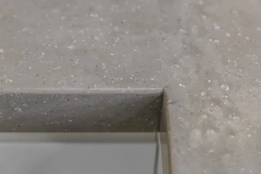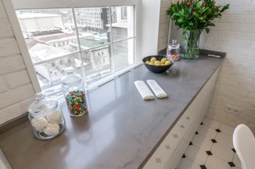 Столешница серии StoneTwelve общей длиной более 5 метров и толщиной 40 мм. По длинной части кухни глубина столешницы 615 мм (такая глубина потребовалась из-за нестандартных размеров встраиваемой техники), по короткой – 600 мм. Материал столешницы – «Бетонный камень».