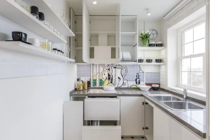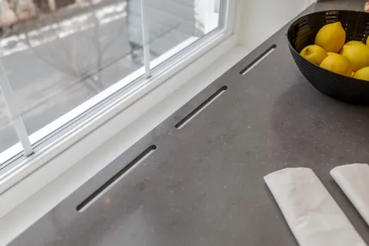 Над дополнительной зоной хранения в столешнице сделаны специальные вентиляционные вырезы, чтобы пропускать теплый воздух от радиатора, расположенного под окном.