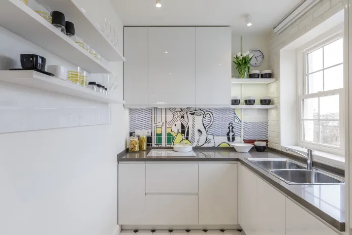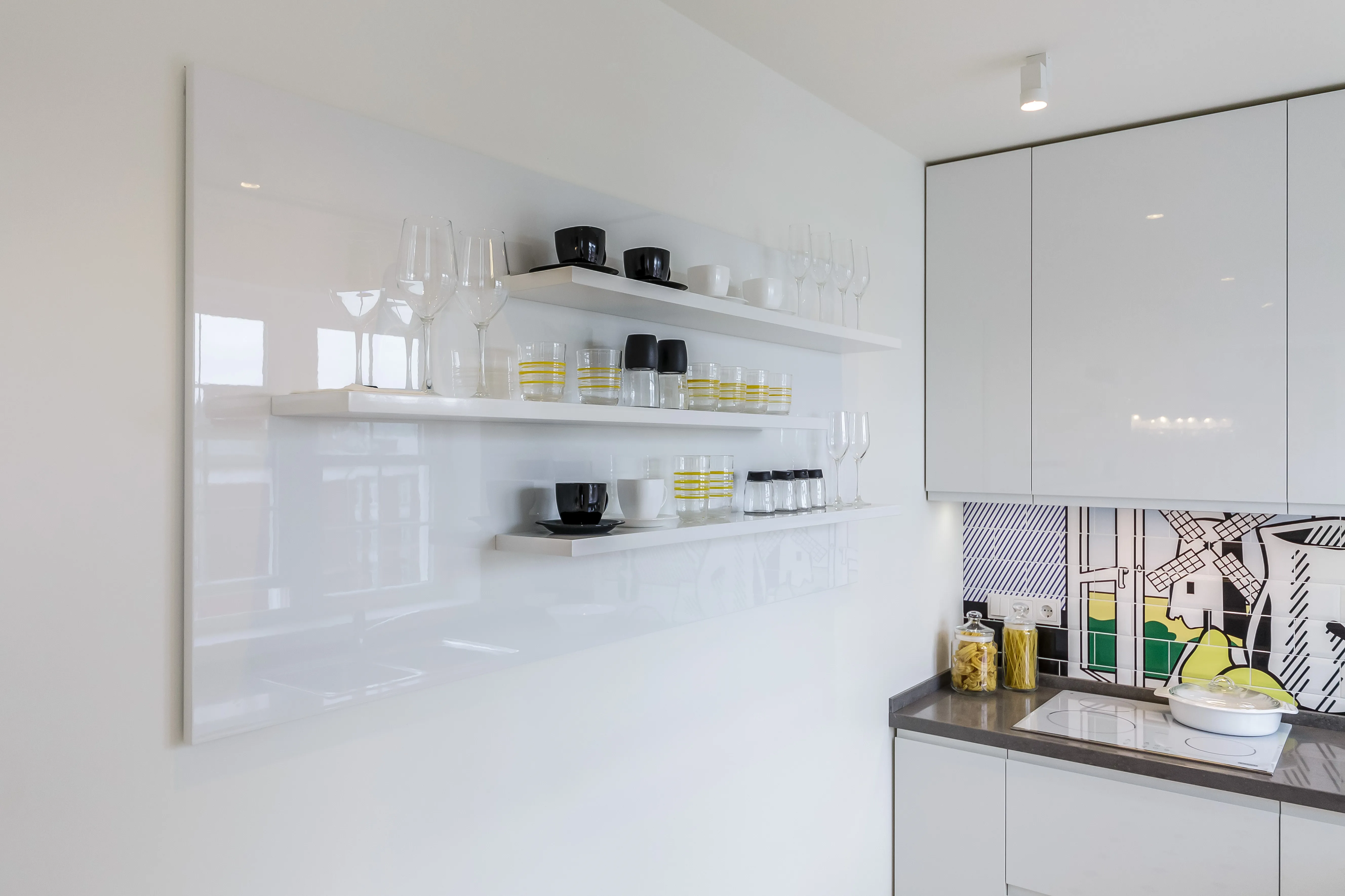На стене слева от кухни отдельно выполнена стеновая панель с полками на консольных штоках. Все из МДФ в белой глянцевой эмали.