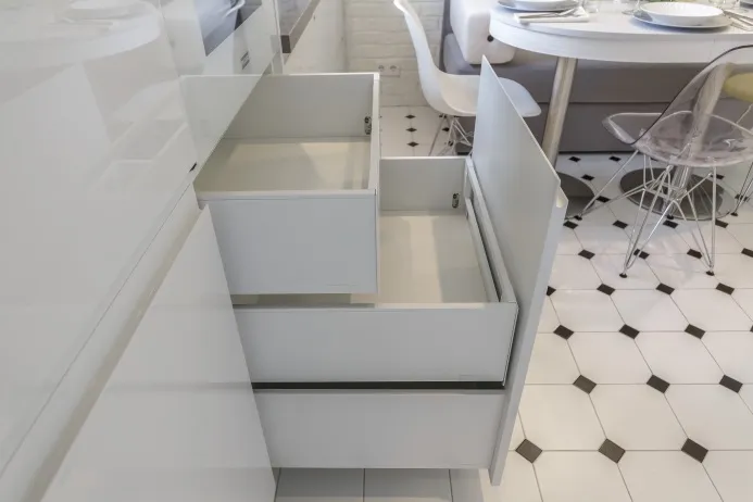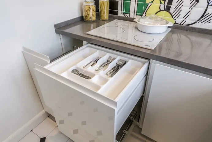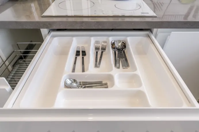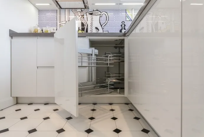 В один из ящиков поместили лоток для столовых приборов. В угловой модуль встроили так называемый «волшебный уголок» - таким образом задействовали пространство, которое часто остается просто пустым, и добавили места для хранения различных полезных на кухне вещей.