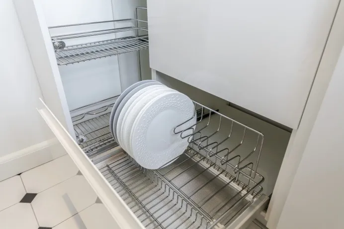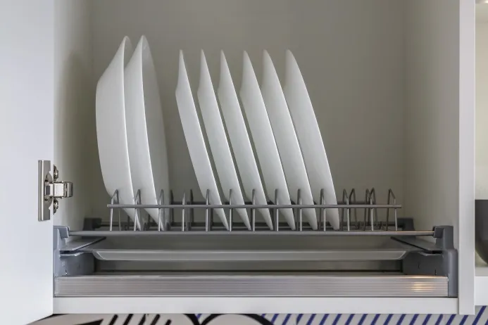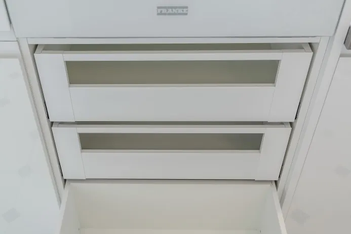 В рабочей зоне внизу разместили модули с сушками для посуды, выдвижные корзины и ящики Леграбокс. На сегодняшний день, это, пожалуй, самые совершенные ящики с точки зрения отсутствия зазоров, провисания и надежности механизмов скольжения. Нагрузка возможна до 70 кг. Ящики отличает элегантный дизайн и плавное бесшумное закрывание.