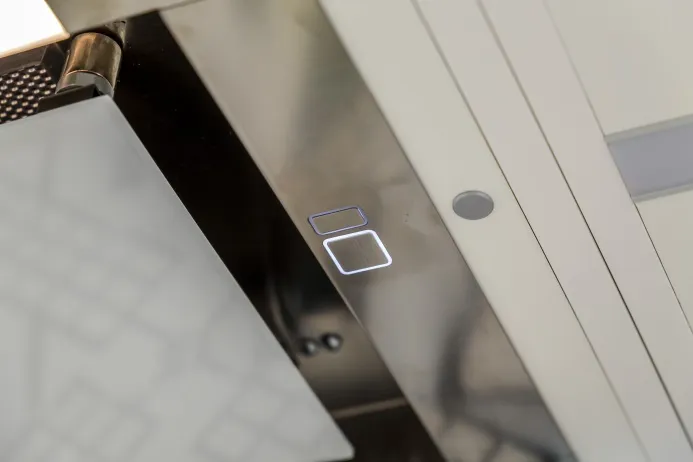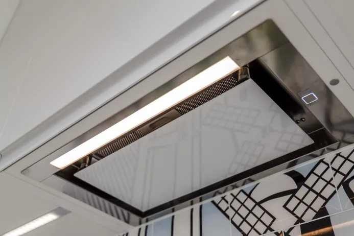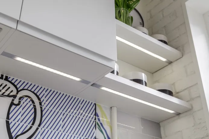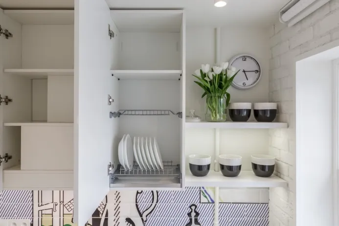 В навесной модуль встроили вытяжку, а также разместили сушку для посуды. Под модулями, как и под открытыми полками, встроена линейная LED-подсветка, управляемая сенсорным выключателем, расположенным рядом с вытяжкой.