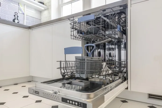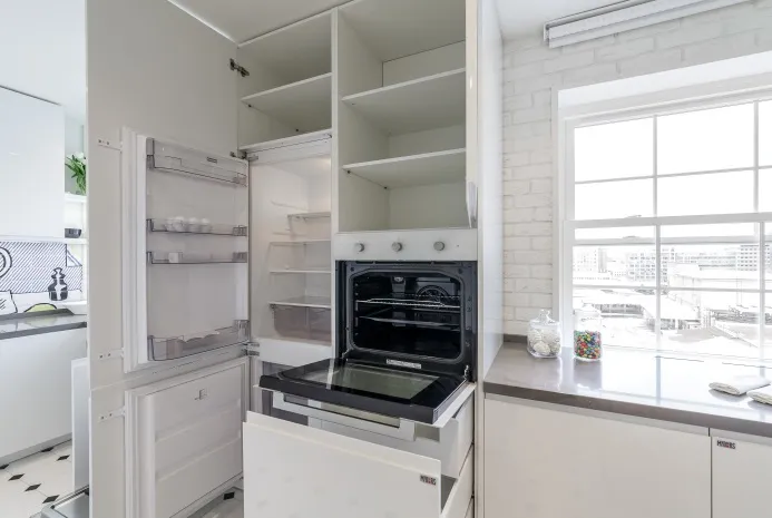 Справа в нижний модуль под мойкой встроили посудомоечную машину. В колонках «спрятали» вместительный холодильник, а также встроили духовку. В шкафу над духовкой расположили электрощит, закрытый в задней стенке шкафа дверцей по принципу Push-to-Open (нажать для открывания). Под духовкой – выдвижные ящики Леграбокс с рейлингом.