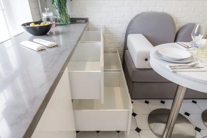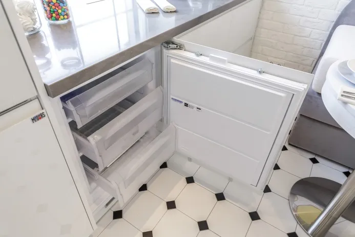 В зоне условной столовой под столешницу встроили дополнительную морозильную камеру, а также организовали места хранения.