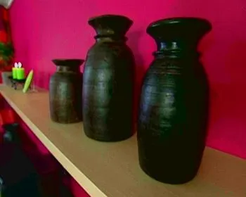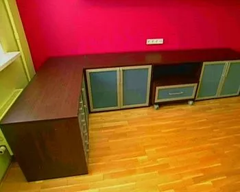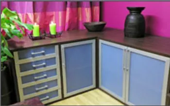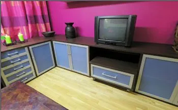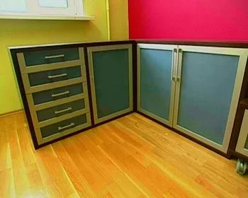 Сделана мебель из ламинированного ДСП, тёмно-коричневого цвета (дуб торонто). Фасады изготовлены из рамочного профиля "под алюминий", а вставки выполнены из пластика (альтуглас) с романтичным названием «голубой лёд».
