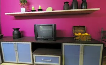 Тумбы снабжены ящиками и полками, а одна из тумб ещё и колёсиками, благодаря которым может передвигаться и дополнительно служить в качестве сиденья. Прямо над мебельным блоком, в контраст мебели, укрепили полку, отделанную под светлый дуб.