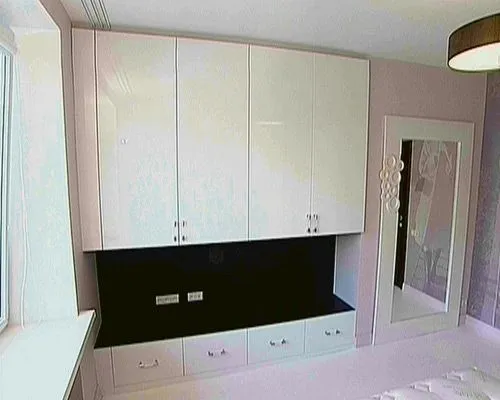 Чтобы освободить как можно больше пространства в комнате, было решено использовать имеющуюся нишу, в которую встроили шкаф c распашными фасадами. Дверки верхней секции шкафа сделали высотой до потолка, а в середине шкафа оставили пространство для телевизора и техники. Внизу расположили ряд выдвижных ящиков.