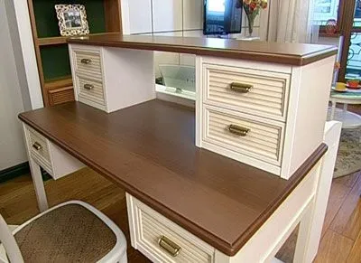 Стол-бюро состоит из основания в декоре «Декапе Жемчуг» на элегантных ножках, изготовленных их массива дерева и придающих ему утонченность и изящество, и столешницы цвета «Орех Антик» из МДФ, украшенной декоративной фигурной кромкой. Под столешницей расположены две ниши для выдвижных ящиков, а на ней - наставной модуль с четырьмя ящиками. Фасады ящиков – рамочные, вставки – панели «Буазери» в декоре «Декапе Жемчуг», ручки – «Барра».