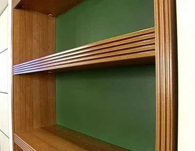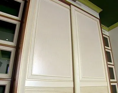 Сами двери состоят из трех частей. В средней части в раму вставлены декоративные панели «Буазери» (изготавливаются из 100 % натуральной березовой фанеры, фрезеруются, лакируются и патинируются). А верхняя и нижняя части дверей украшены так называемыми «вставками с филенками», т.е. в основную раму двери сперва вставляется еще одна рама, а уже в нее - ламинированная панель в декоре «Декапе Жемчуг». Такое комбинирование придает шкафу дополнительный шарм и стильность.