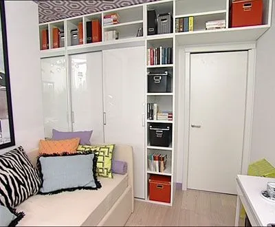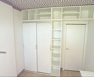 Встроенная композиция заняла всю стену с дверным проемом. Она состоит из гардероба с дверями-купе, подвесной антресоли и открытого стеллажа с полками для книг и журналов.