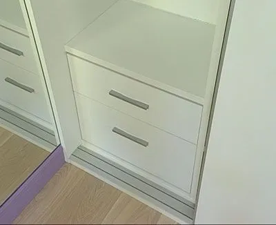 Каркас шкафа-купе, антресоль, открытый стеллаж и столешница, а также фасады выдвижных ящиков выполнены из ламинированной плиты толщиной 25 мм класса Е1 (производитель – Egger, Австрия) в декоре «Белый Премиум».