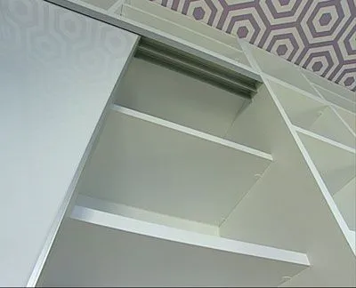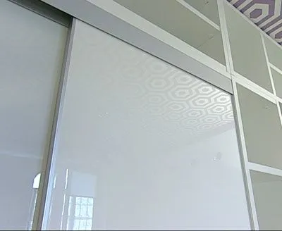 Раздвижные двери шкафа-купе - из серии «Нотеборн Кутюр». Каркас дверей окантован алюминиевым профилем так, что видна только узкая полоска канта, это придает конструкции изящество и воздушность. Вставкой в раму служит панель МДФ, покрытая высокоглянцевой белой эмалью. Двери снабжены накладными ручками «Кутюр».