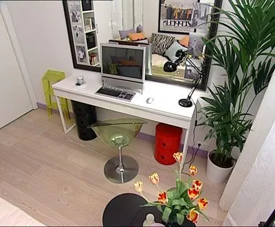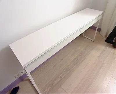 Белый рабочий стол поставили у стены напротив кровати. Отделка есть и на задней панели, так что стол можно при необходимости разместить в центре комнаты. Столешница достаточно длинная – за ней могут поместиться и двое.