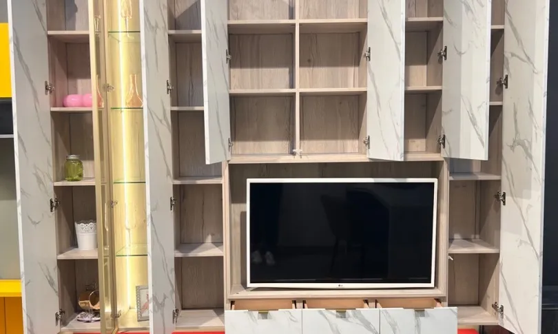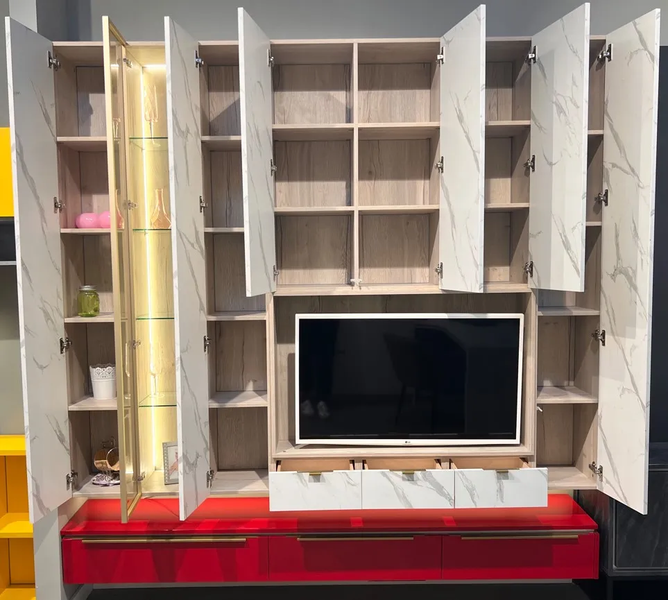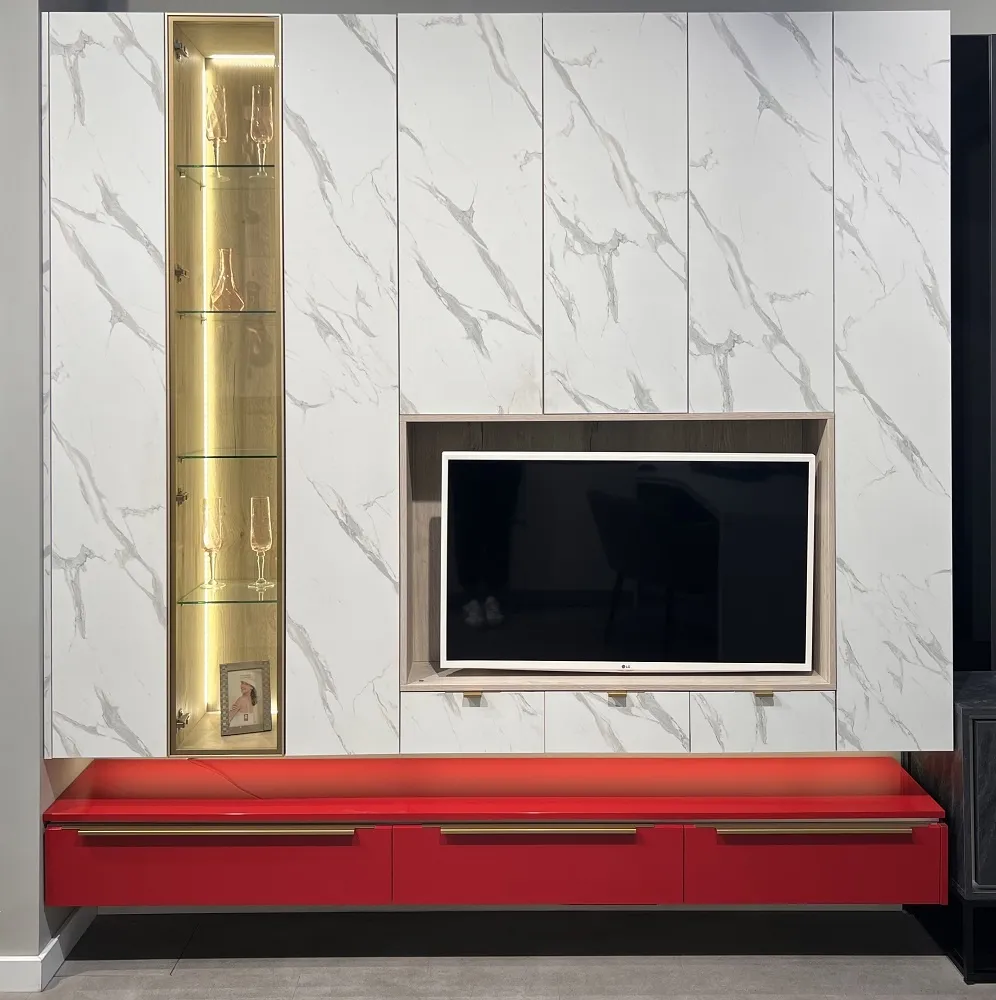 3. Фасады накладные, распашные TSS 18 мм ZR Мрамор Статуарио. Открывание Р2О, полки ДСП 16 мм. Фасад FuturSX декор XG рамы Матовое золото, вставка стекло НВ Гавана, полки стекло;