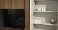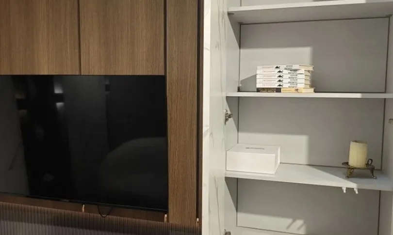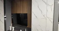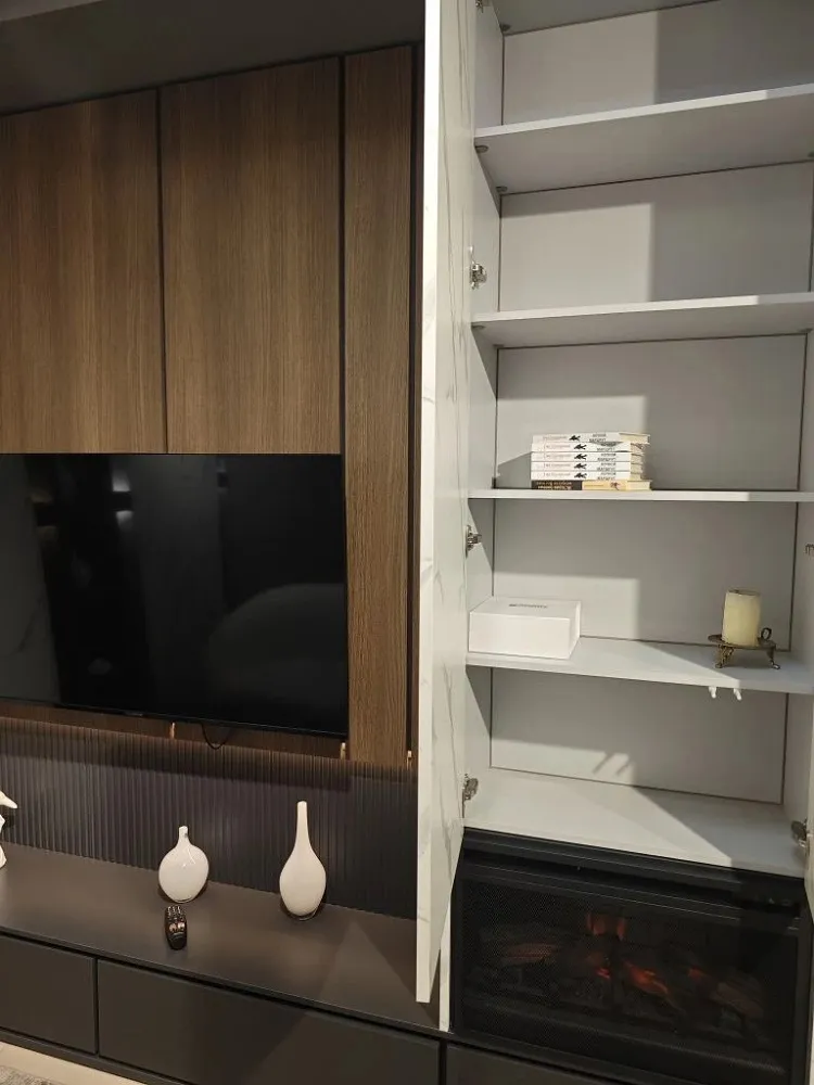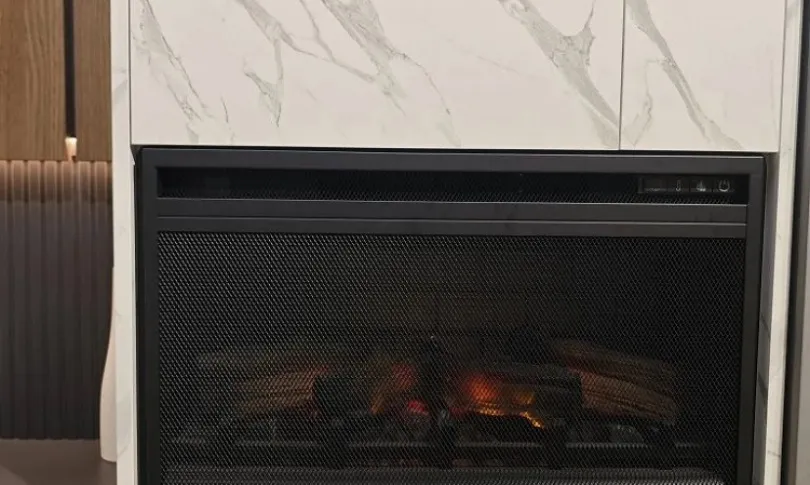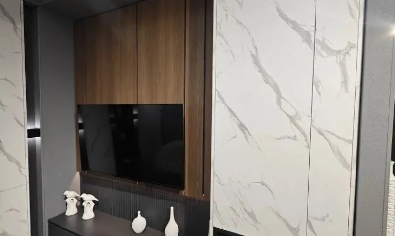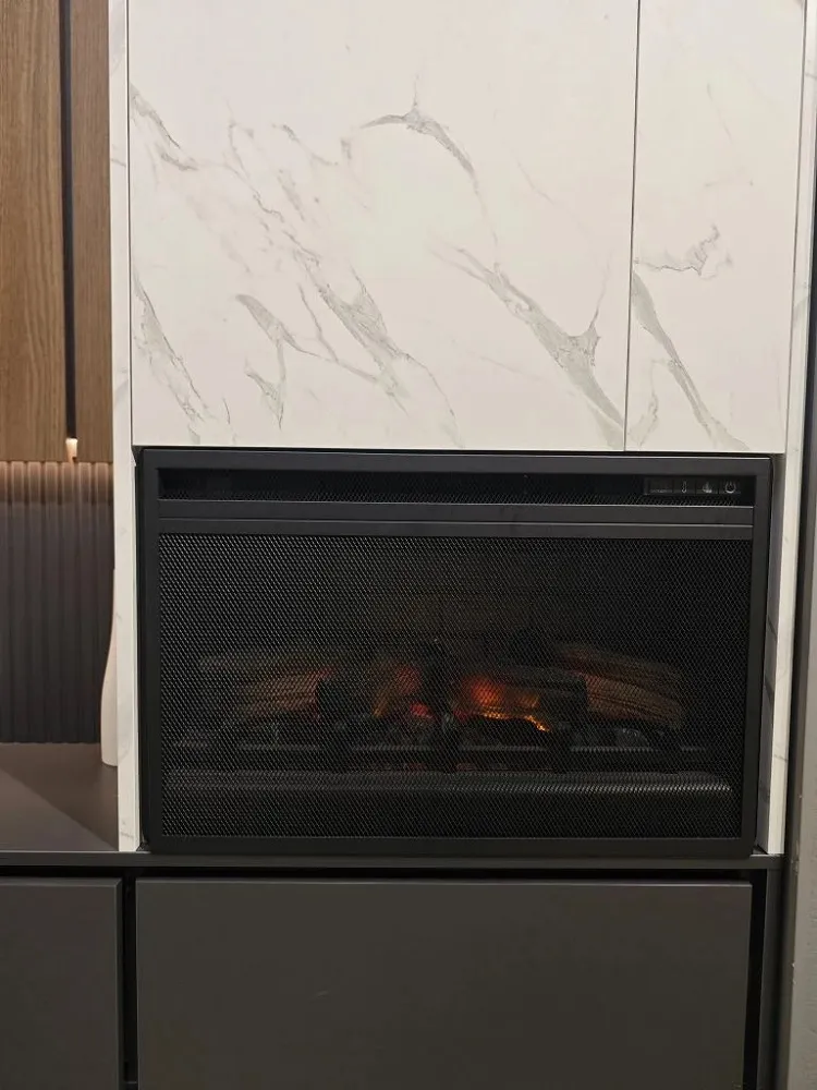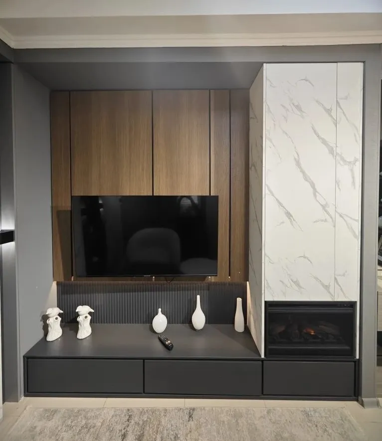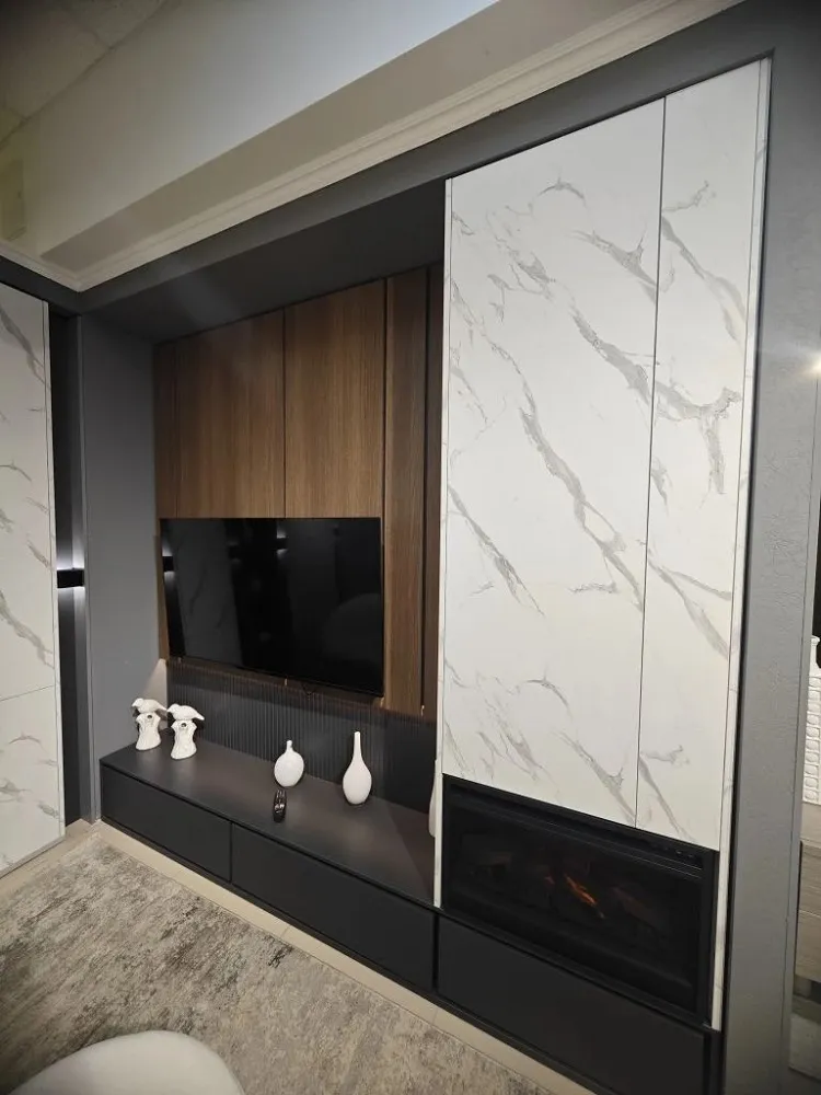 Корпус ЛДСП Гейнсборо, Графит, фасады Мрамор Статуарио, стеновые панели TSS – Кверча Маккиато, подсветка, камин.