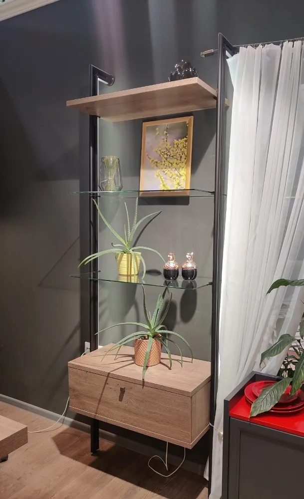 Стеллаж с выкатным ящиком и подсветкой по задней стенке. Cтальной профиль, материал ящика – ЛДСП Egger.