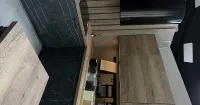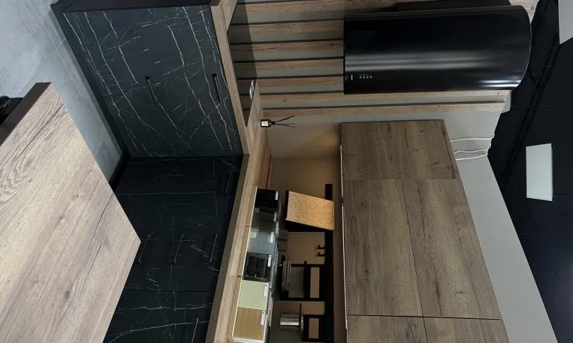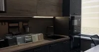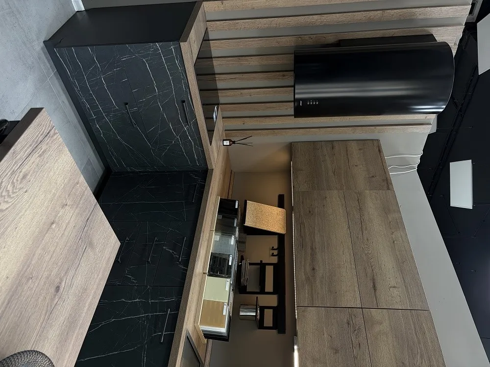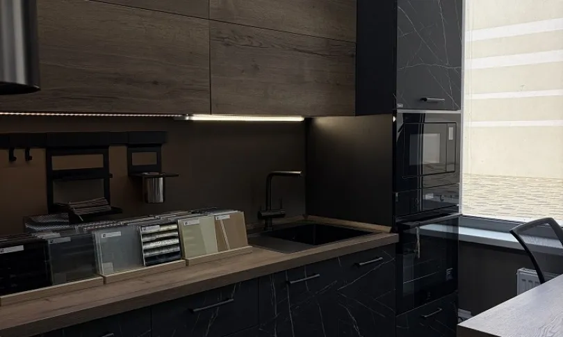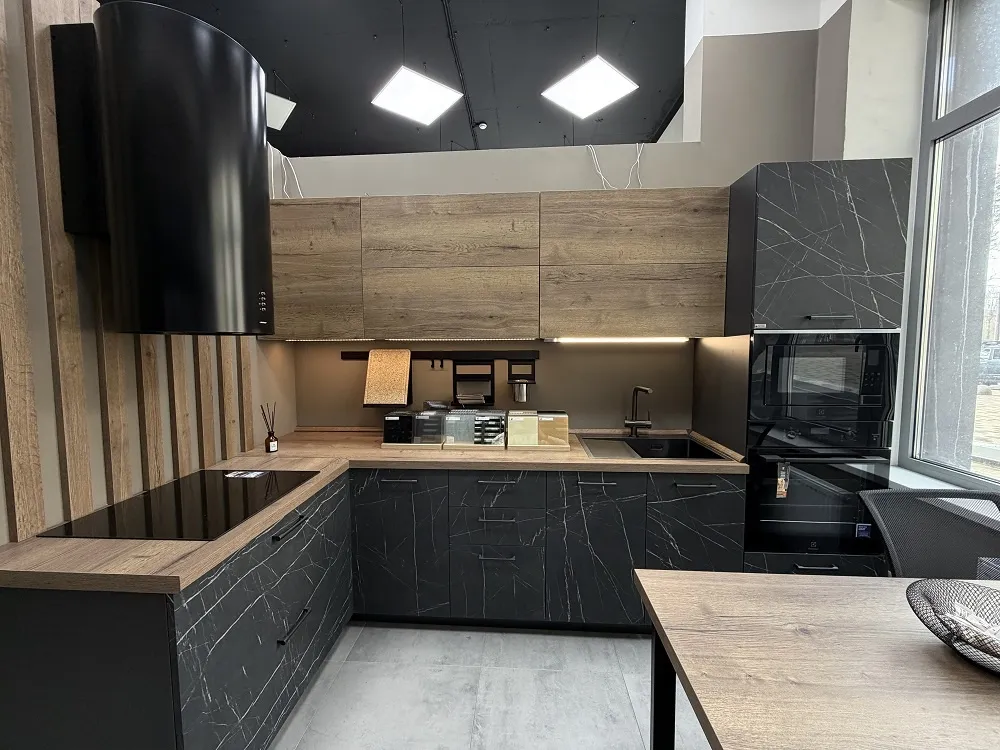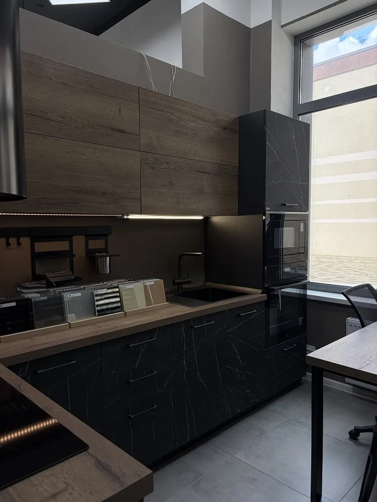 Корпус кухни: ЛДСП EGGER 16 мм, Дуб Галифакс, Графит. Опора кухонная Н-100 мм. Фасады: Vitra верт. н.в., Пьетра Чёрный мат. (MPB). Ручки: Пайплайн 160 арт. 3503, Лаккато черный (XL). Верхние фасады: Eurodecor 16 мм гор. н.в, Дуб Галифакс 2 кат. (OX) . Столешница: HPL Price Minus Feelwood Кромка ламинат, Филвуд Дуб Галифакс табак. Выдвижные ящики Legrabox Blum. Сушка двухуровневая с раской и поддоном.